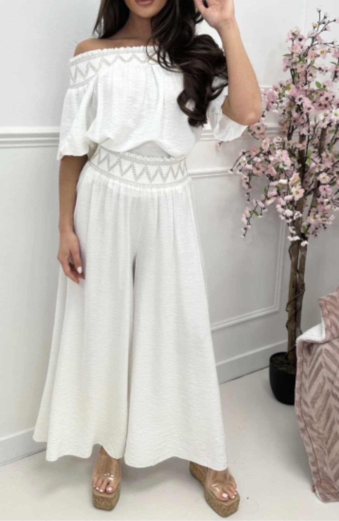 Macie Co Ord Bardot Top & Plazzo Set Warm White